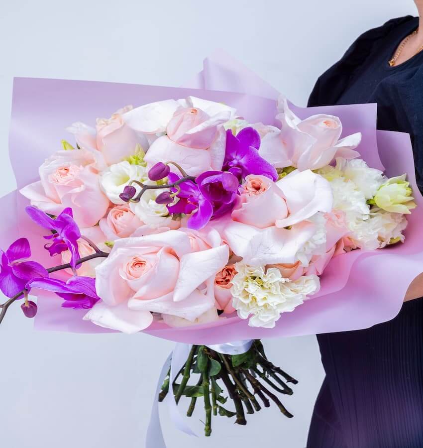 Bouquet grande de rosas abiertas, lisianthus y orquideas.